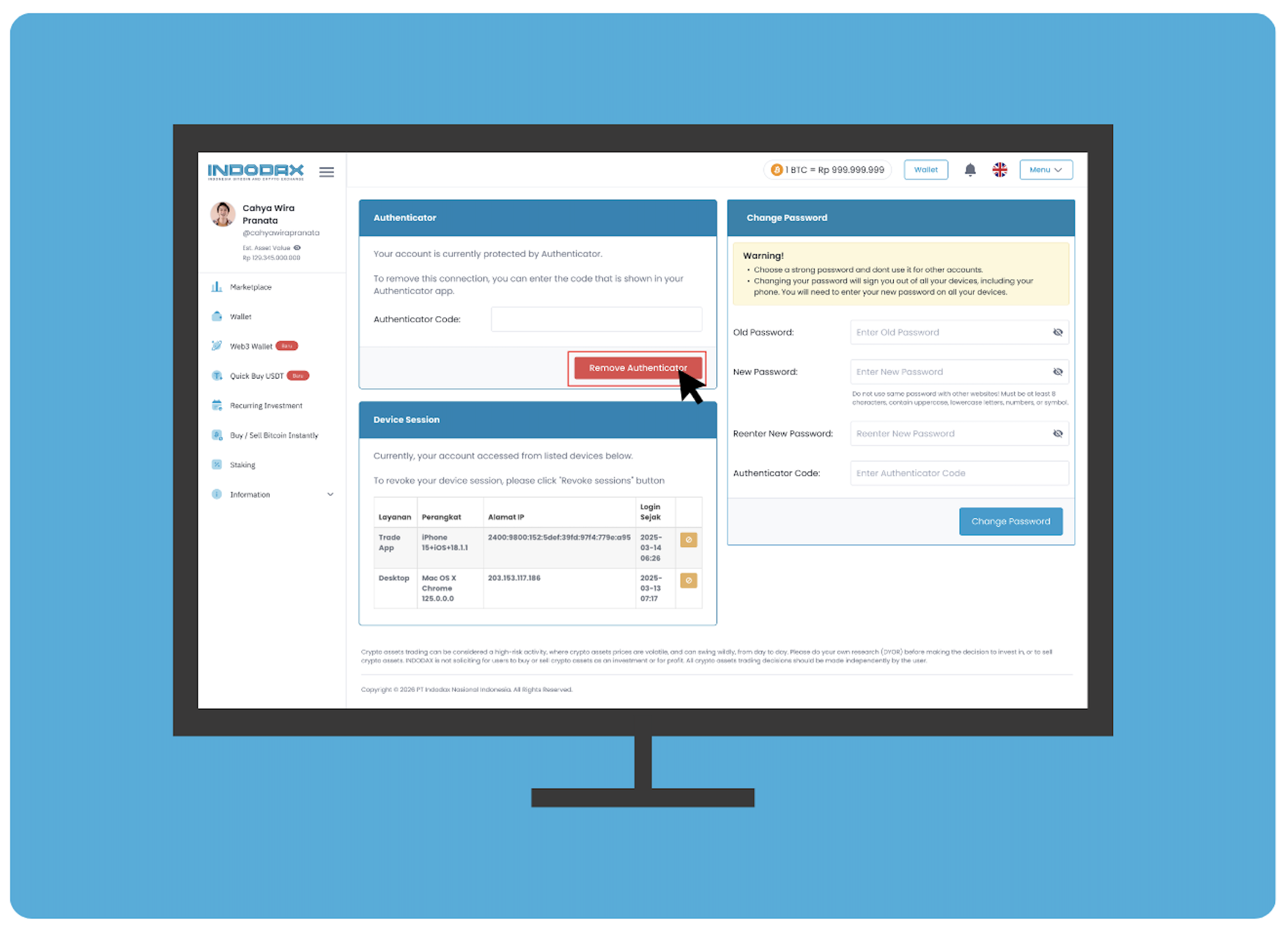 If you have previously activated Authenticator but no longer want to use it, you can reset the Authenticator connected with your Indodax account. However, we strongly recommend that you continue to use Authenticator, as turning off Two-Factor Authentication could increase the risk of unauthorized access to your account. There are two methods for resetting Authenticator: one if you still have access to it, and another if you have lost access to or no longer have Authenticator.
