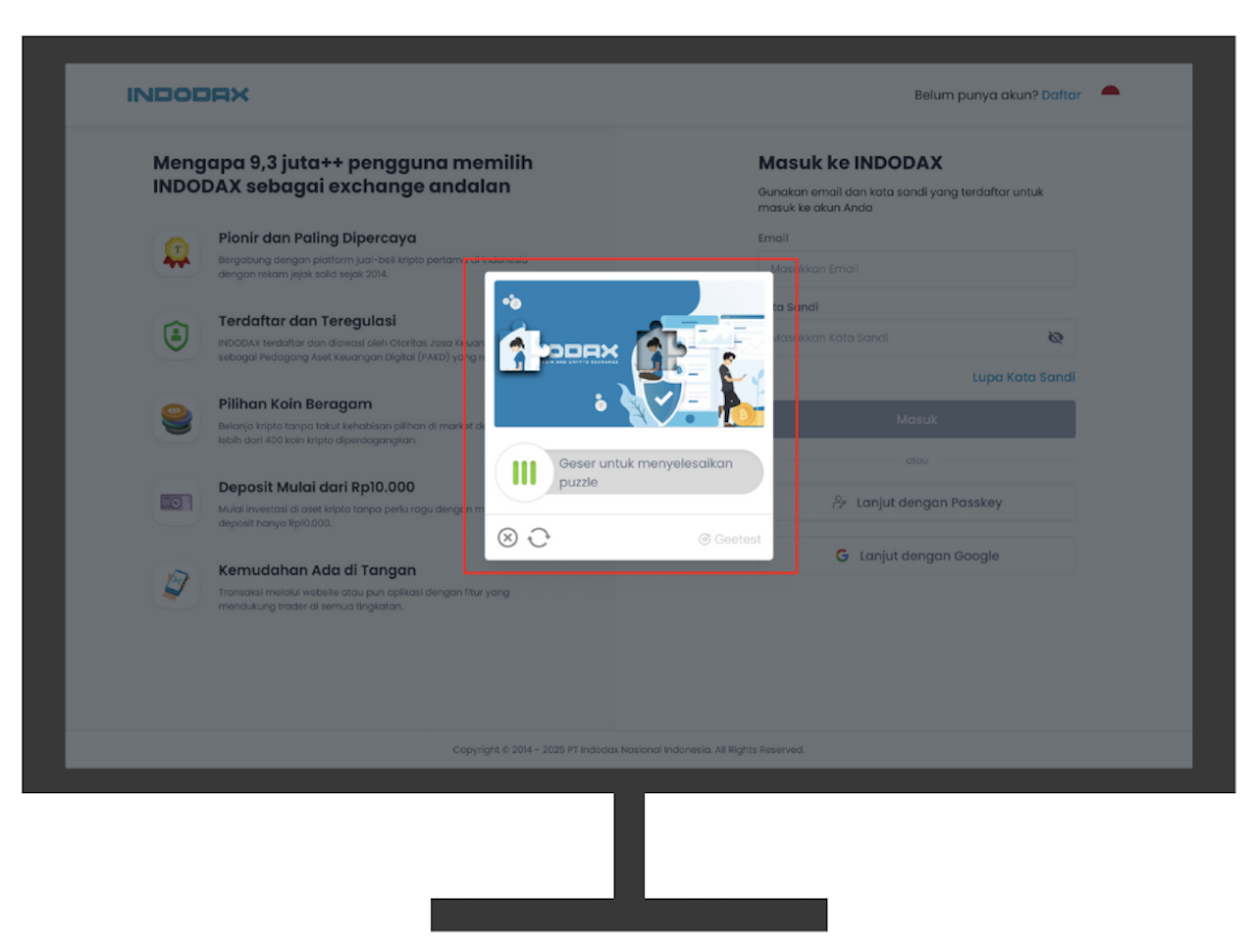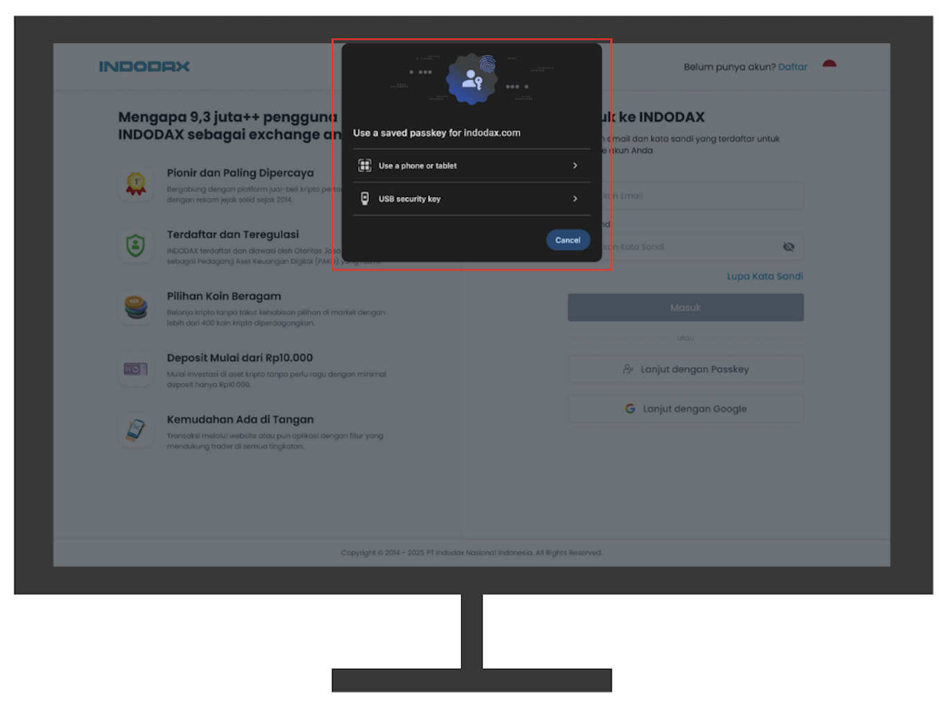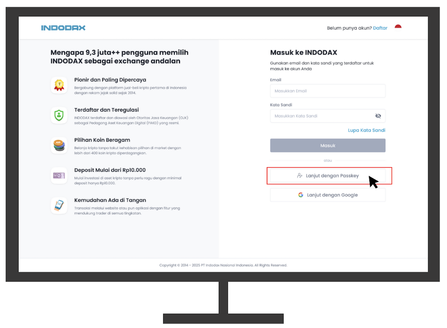 Visit https://indodax.com/login then select the “Continue with Passkey” option.